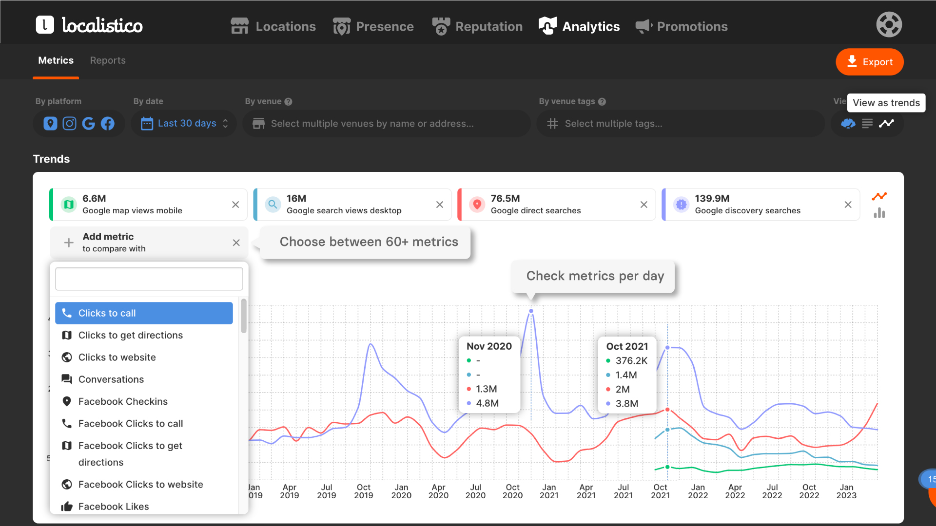 You need to be aware of what your customers are saying about your locations - both keeping informed and replying to solve issues or misunderstandings. The right management of your interactions can turn a bad experience into a loyal customer. Our platform enables you to track and respond to all reviews, ratings, and user-generated content in an aggregated single inbox where an array of reports can be created.