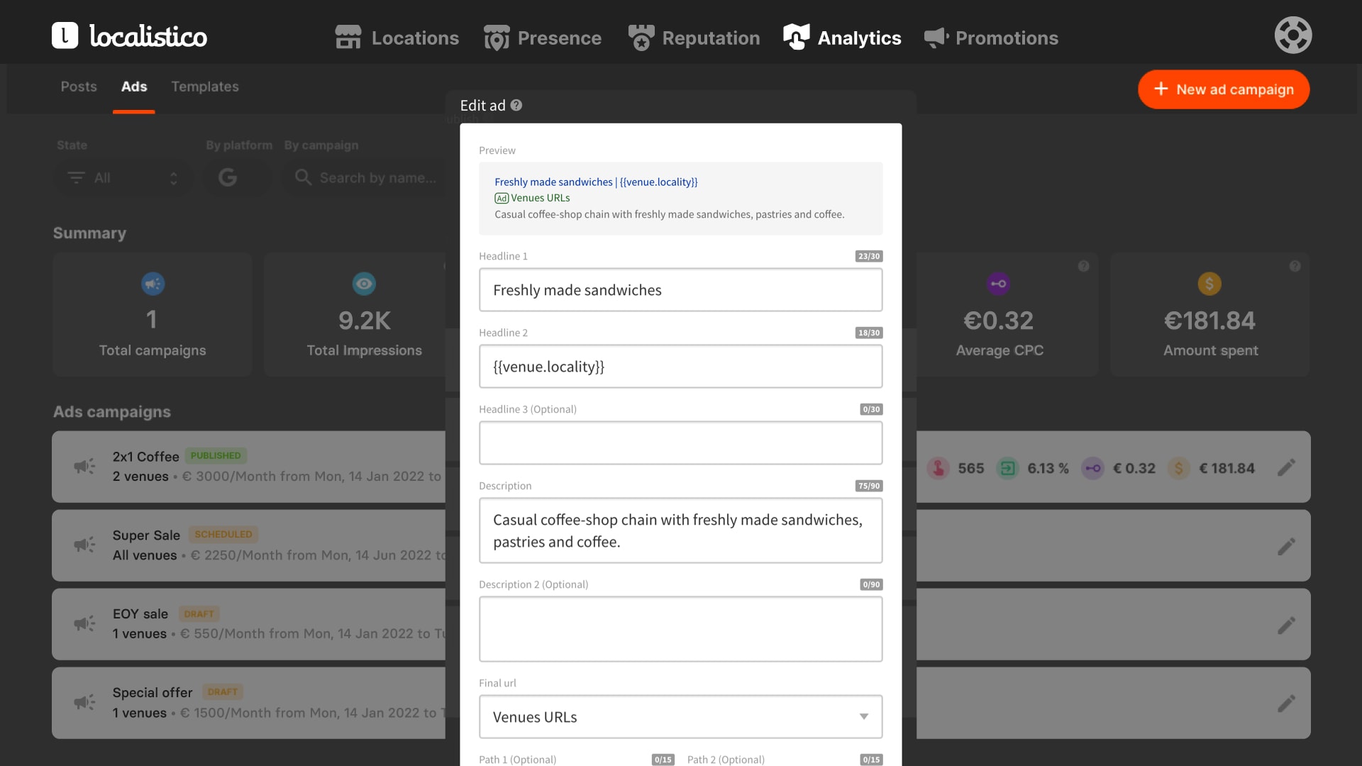 Highlighting the arrival of a new store, pop-up or in-store concession is a challenging task. Our platform can enable the automation of local targeted digital advertising and instant profile creation on all relevant platforms: Google, Facebook, Apple, Foursquare, Yelp, TripAdvisor among many others.