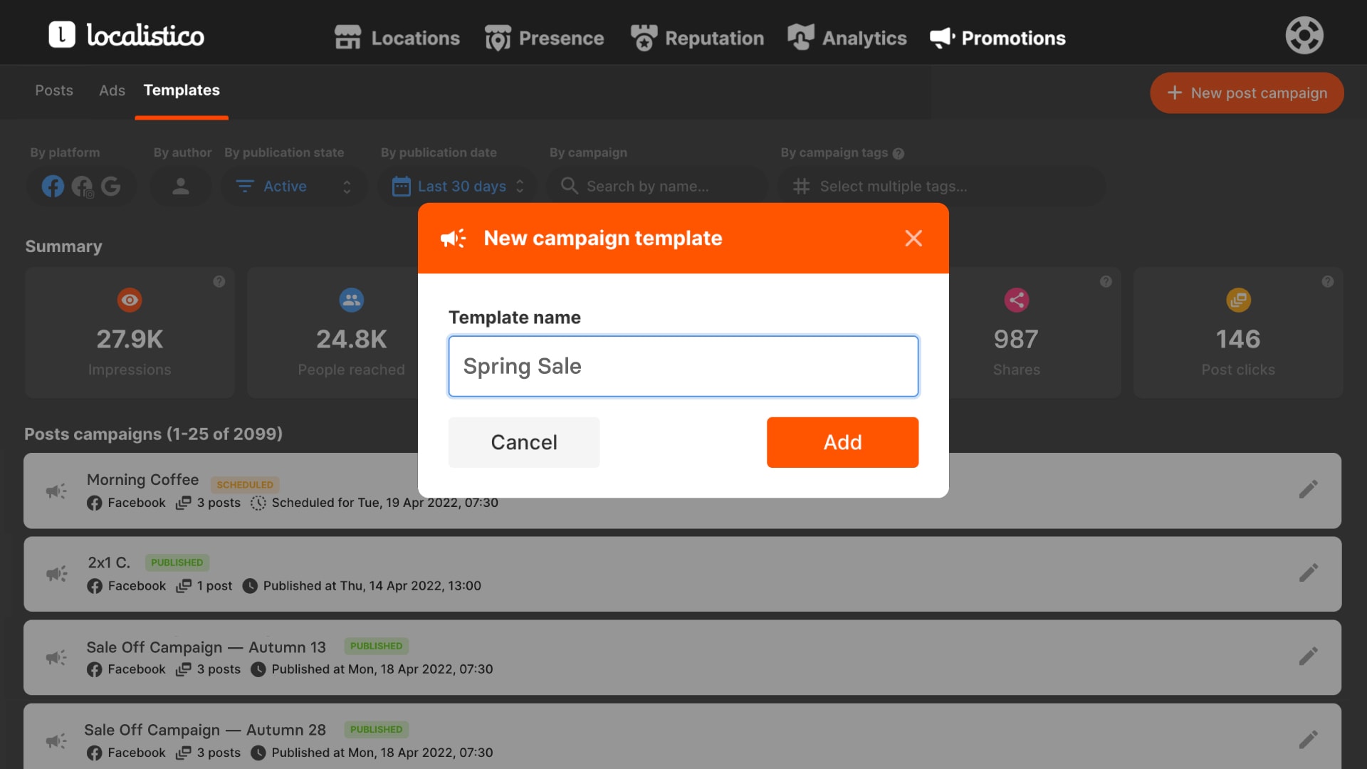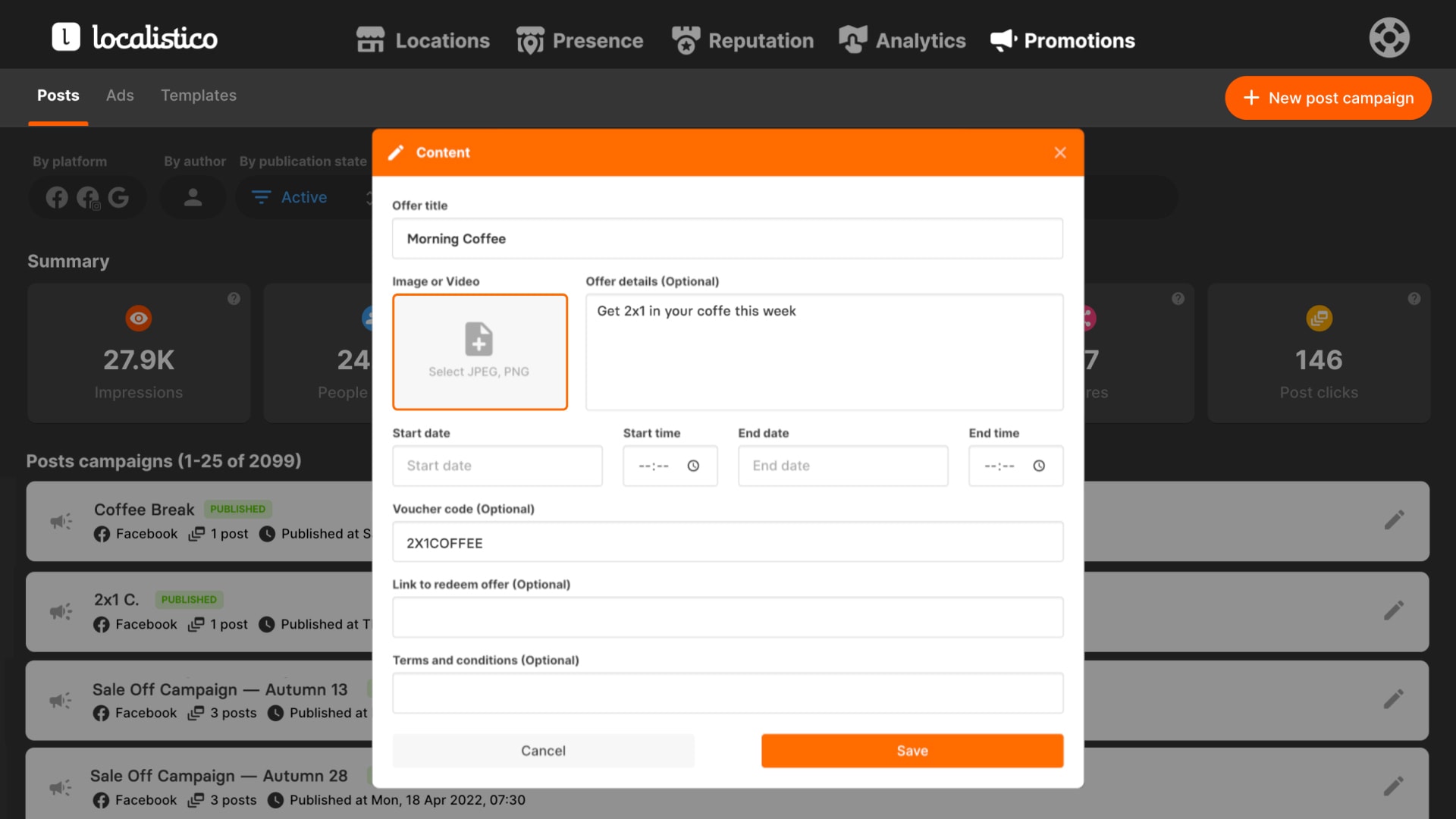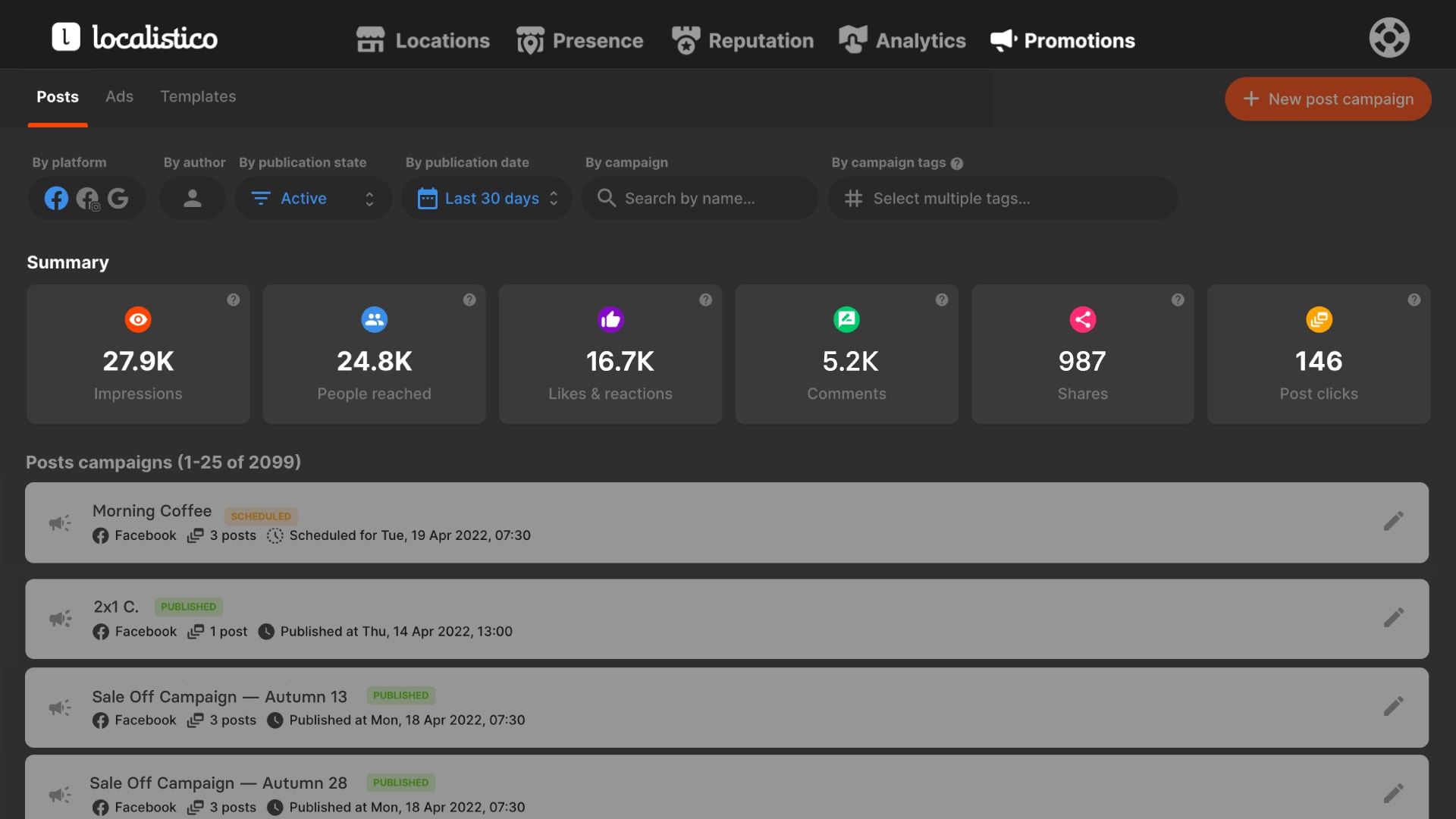 Communicate your stores’ local promotions, offers, stock or events to boost store traffic, selecting the appropriate keywords to impact the Google, Facebook and Instagram ranking algorithms along the way.