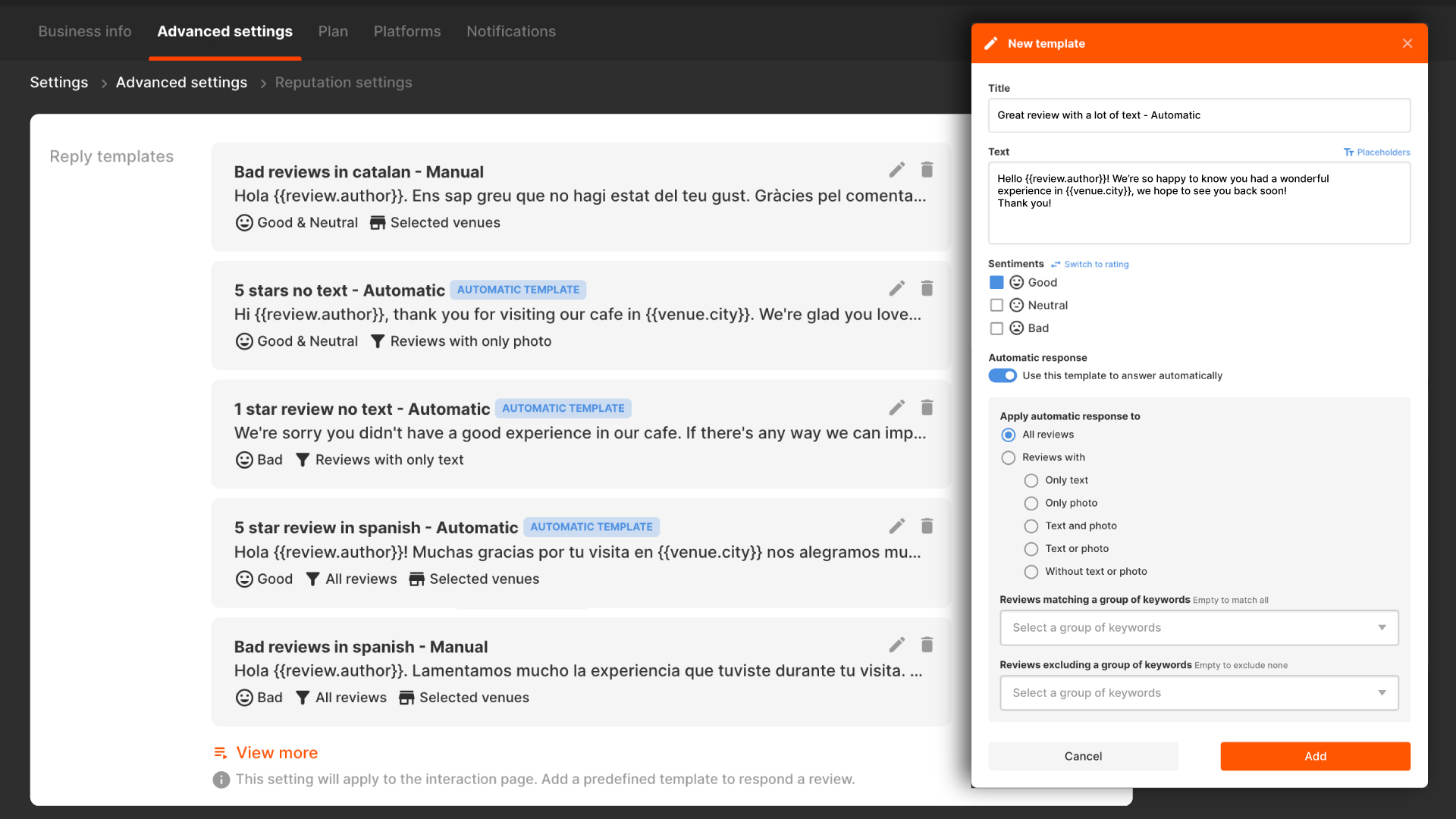For when you have lots of reviews to answer but you still want the personal touch - create default templates to answer in 2 clicks.