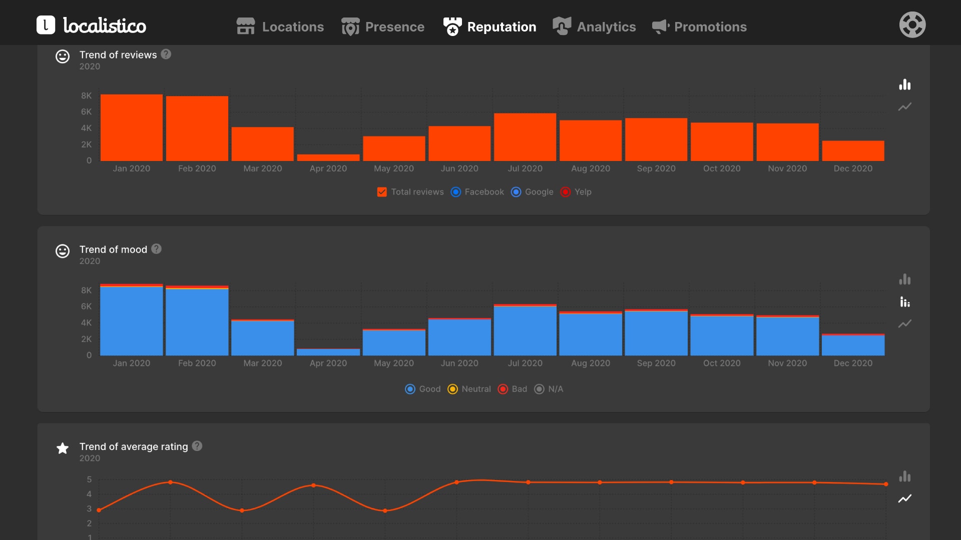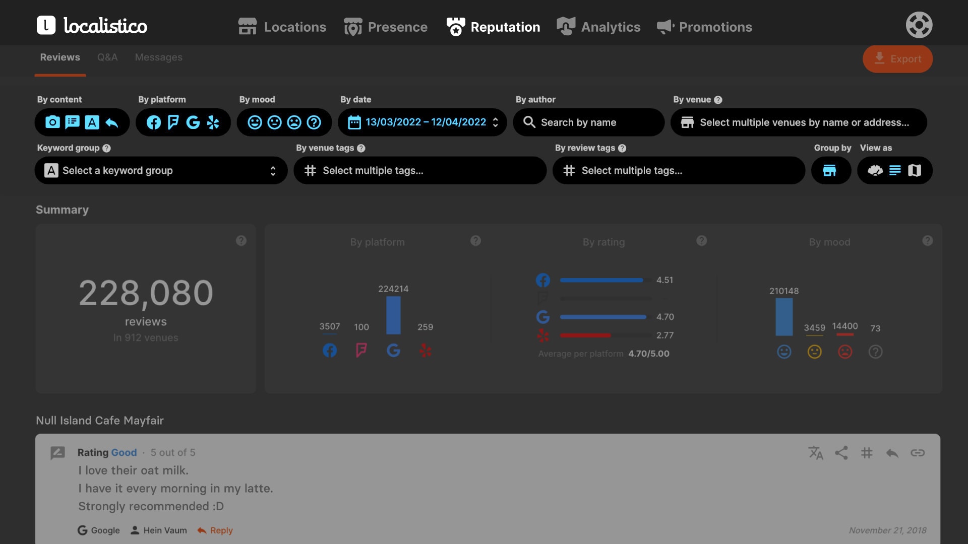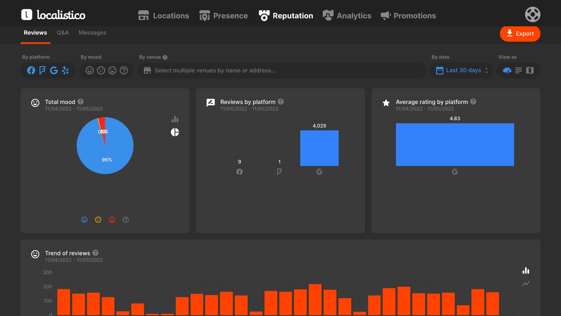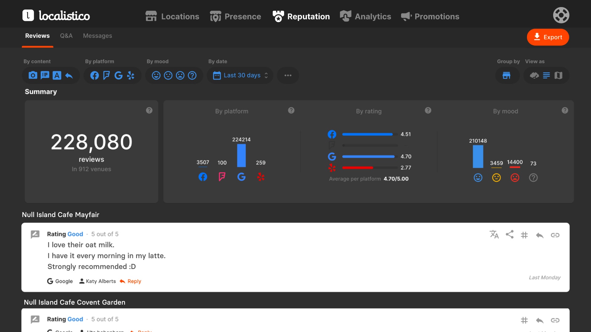Review insightsAnalyse which platforms are driving more interactions and how your scoring is for each.