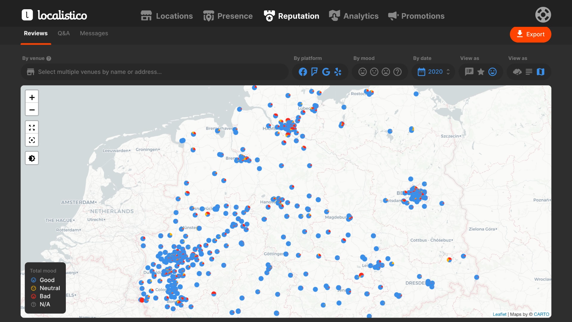 Map viewsVisualise data about which locations drive more reviews or their sentiment, in an easy and visual way.