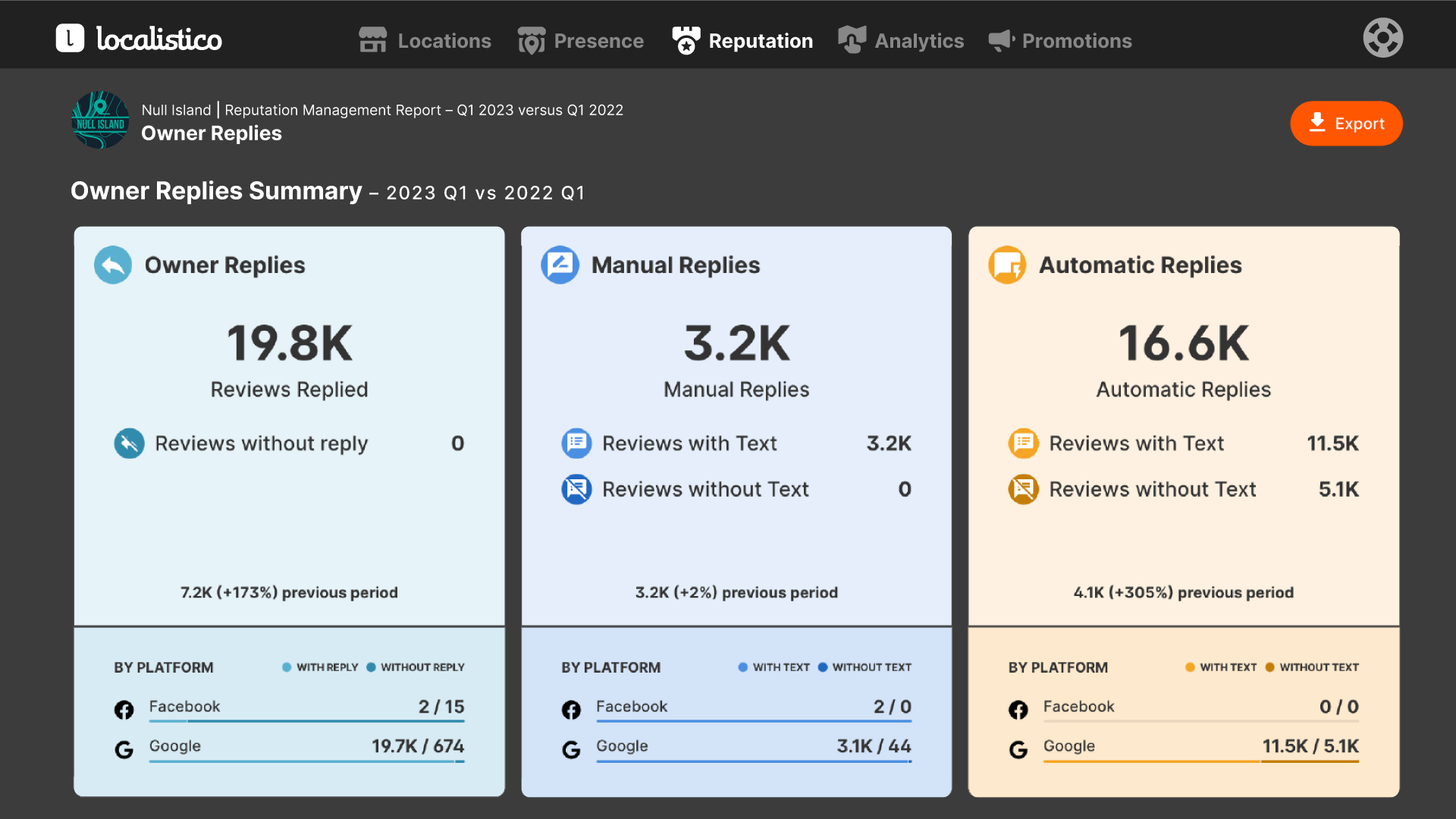 DashboardsGive access to members of your team or area managers to view or answer reviews for all or a given subset of locations.